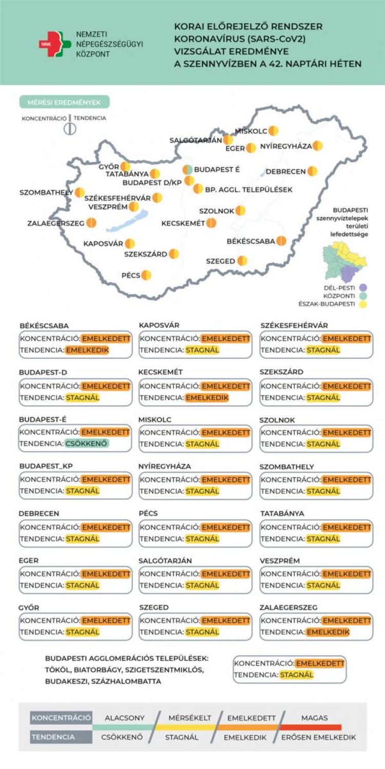 A vizsgált városok többségét stagnáló tendencia jellemzi, emelkedés Békéscsabán, Kecskeméten és Zalaegerszegen tapasztalható, míg csökkenés az Észak-pesti Szennyvíztisztító Telep mintájában mérhető. A SARS-CoV-2 örökítőanyag koncentrációja minden hazai mintavételi helyen az emelkedett kategóriába esik.