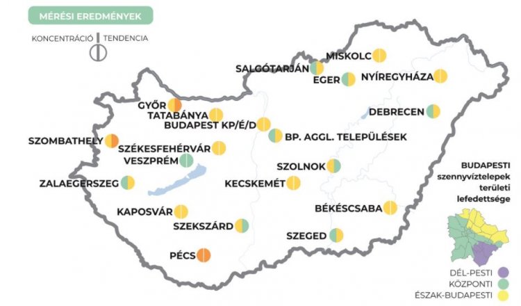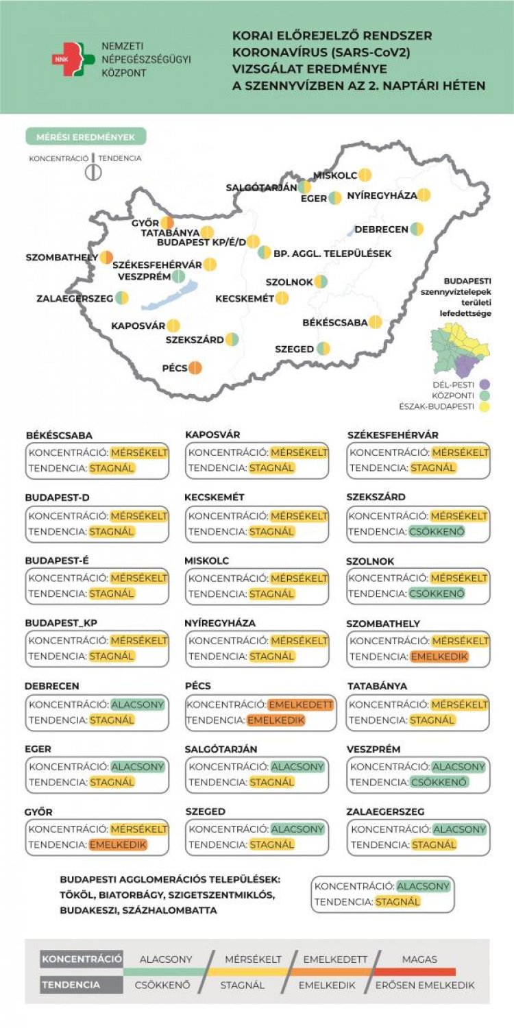 Ezen a héten emelkedő tendenciát Győrben, Pécsett és Szombathelyen mértek, míg csökkenő tendenciát állapítottak meg Szekszárdon, Szolnokon és Veszprémben. Az új koronavírus koncentrációja Debrecenben, Győrben, Salgótarjánban, Szegeden, Veszprémben, Zalaegerszegen, valamint öt Budapest környéki településen (Tököl, Biatorbágy, Szigetszentmiklós, Budakeszi, Százhalombatta) már alacsony, Pécsett azonban az átlagosnál magasabb.