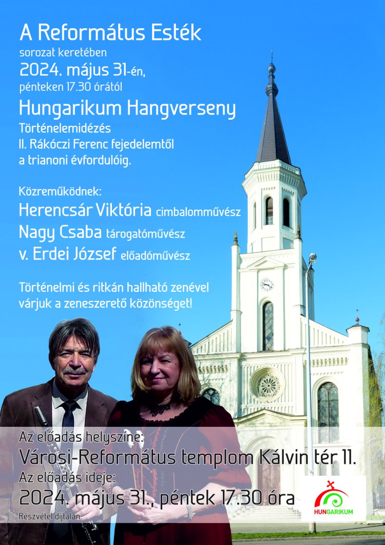 A Református Esték keretében Hungarikum Hangversenyre kerül sor. A két főszereplő hangszer a cimbalom és a tárogató lesz.