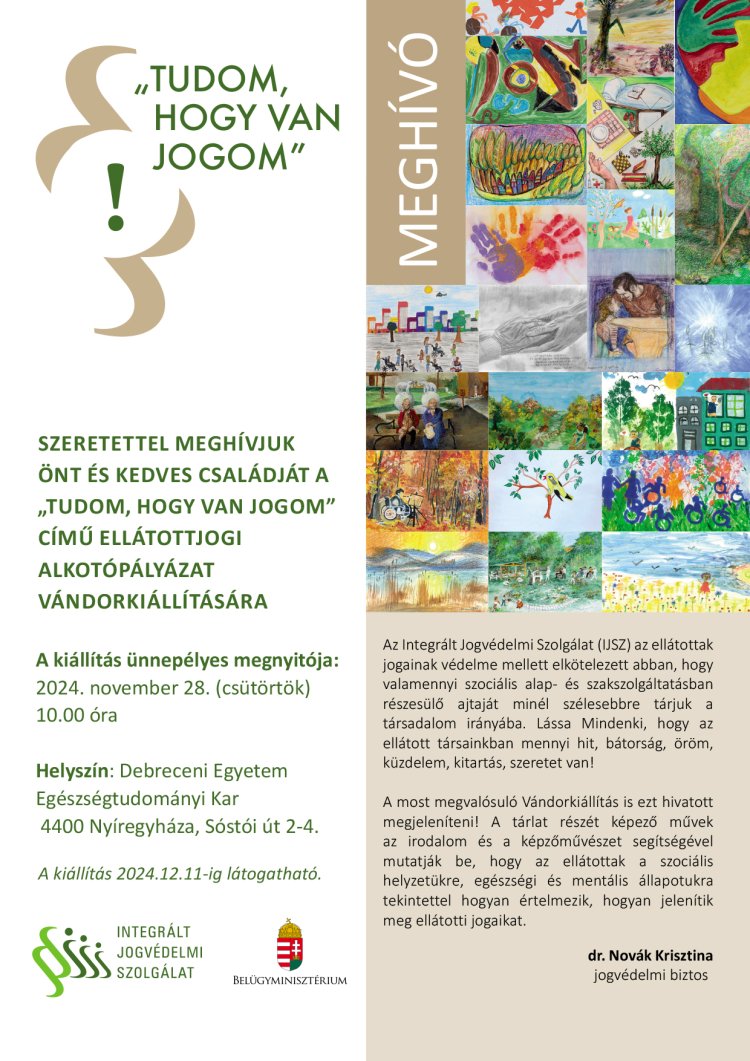A Belügyminisztérium Integrált Jogvédelmi Szolgálata idén „Tudom, hogy van jogom” címmel ellátottjogi vándorkiállítást szervezett az ország különböző pontjain. November 28-án a kiállítás a Debreceni Egyetem Egészségtudományi Karára költözik.
