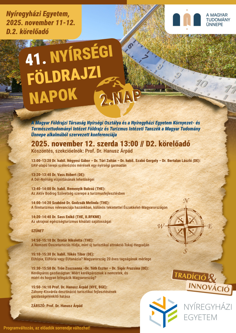 A Magyar Földrajzi Társaság Nyírségi Osztálya és a Nyíregyházi Egyetem Környezet- és Természettudományi Intézetének Földrajz és Turizmus Intézeti Tanszéke idén novemberben immár 41. alkalommal rendezi meg a Nyírségi Földrajzi Napokat. A kétnapos konferenciát a Magyar Tudomány Ünnepe programsorozathoz kapcsolódva tartják 2025. november 11–12-én a Nyíregyházi Egyetem D2-es körelőadójában.