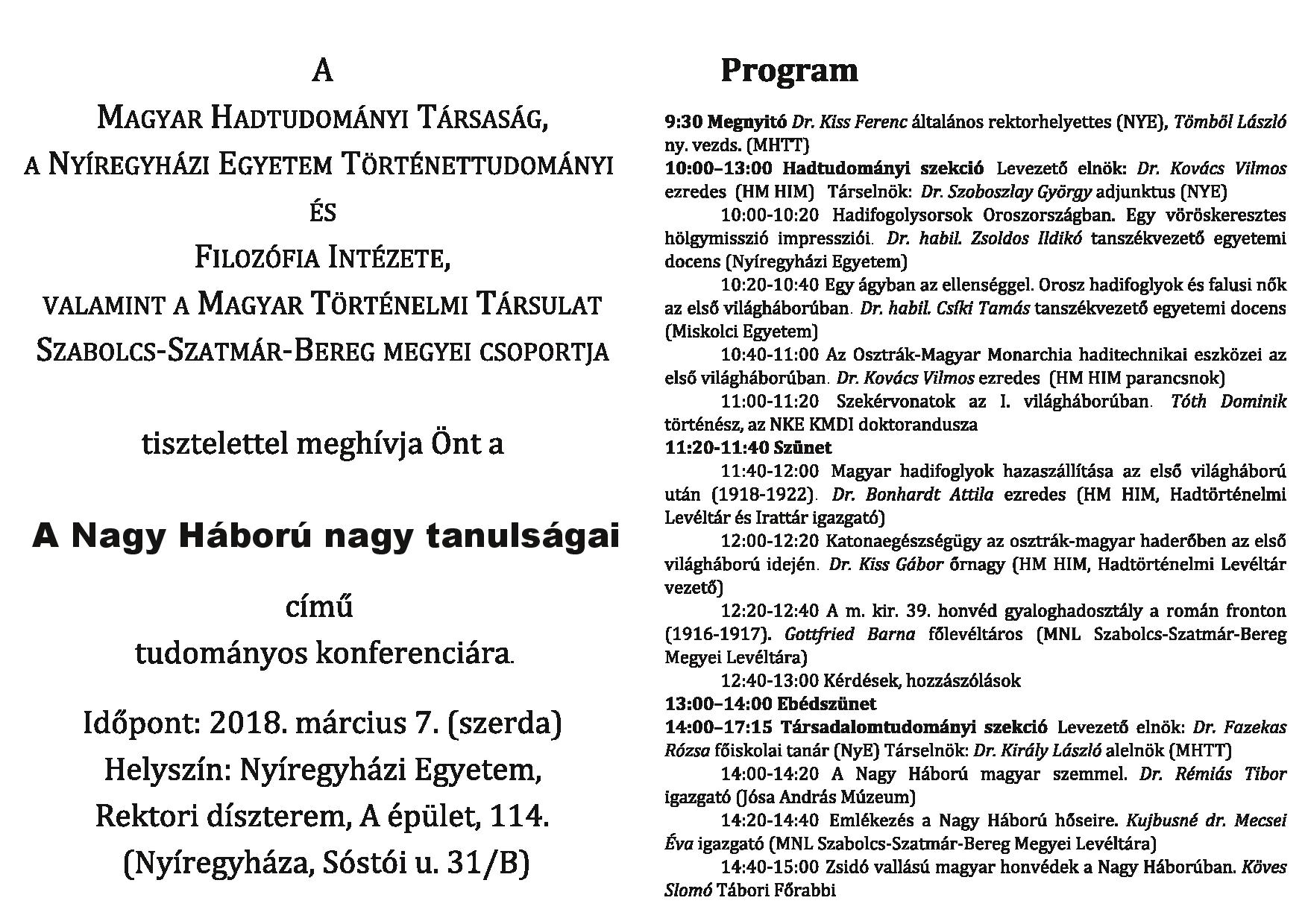 A Nyíregyházi Egyetem Történettudományi és Filozófia Intézete, a Magyar Hadtudományi Társaság és a Magyar Történelmi Társulat Szabolcs-Szatmár-Bereg megyei szervezete „A Nagy Háború nagy tanulságai” címmel rendez tudományos konferenciát 2018. március 7-én (szerdán) 9:30 órai kezdettel a Nyíregyházi Egyetemen a campus „A” épületének 114-es rektori dísztermében.