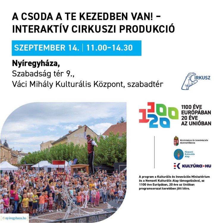 Az Európai Unió Tanácsának soros elnöksége jegyében 1100 éve Európában, 20 éve az unióban címmel országos kulturális programsorozat indult augusztusban. A programsorozatot Nyíregyházára is megérkezik. A Szabadság téren A csoda a te kezedben van! interaktív cirkuszi produkció révén ismerkedhet meg a közönség meg a cirkuszművészet alapjaival .