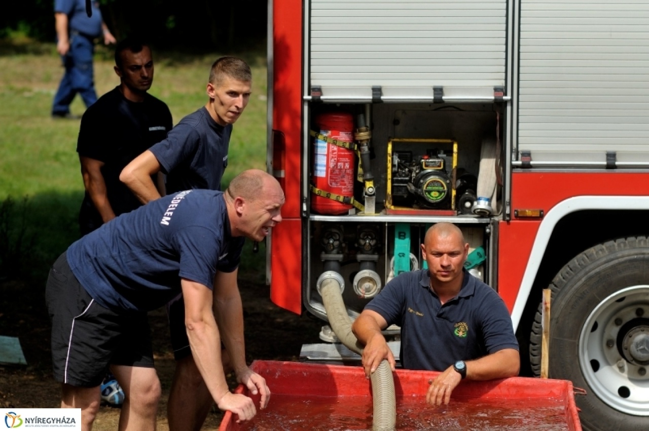 Porral oltóval akadályozza meg az egyik tűzoltó a lángok továbbterjedését. A helyzet nem valós, hanem a hivatásos tűzoltók részére megrendezett megyei sportverseny egyik feladata volt. A megmérettetésre négy parancsnokság jelentkezett: a nyíregyházi, a mátészalkai, a kisvárdai és a nyírbátori.