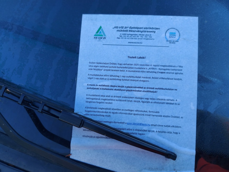 A kivitelező arra kéri az ott élőket, hogy november 4. és 6. között ne parkoljanak a területen, hogy a tervezett munkák zavartalanul elvégezhetők legyenek.