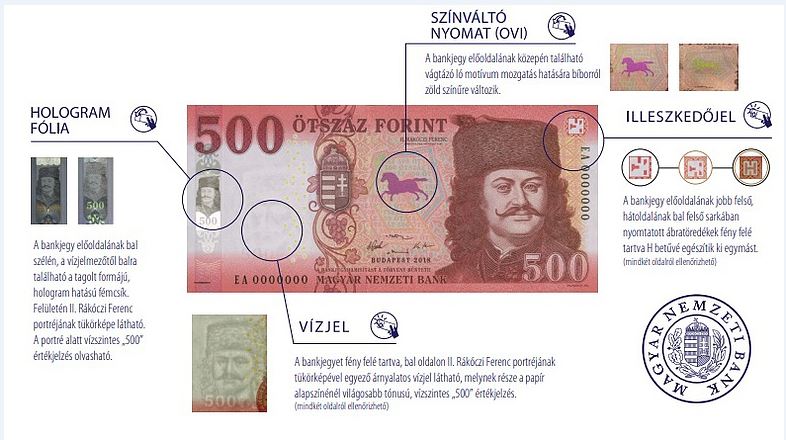 A mostanihoz hasonlóan az új ötszázason elől II. Rákóczi Ferenc portréja lesz, a hátoldalon pedig a sárospataki vár látható. A bankjegyet Pálinkás György grafikusművész tervezte. A megújított 500 forintos bankjegyen lévő biztonsági elemeket, vagyis azt, hogy nem hamis, a hétköznapi használat során, segédeszközök nélkül is ellenőrizni lehet: