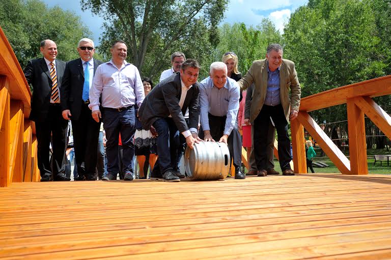 A hagyományokhoz híven, söröshordót gurít át a hídon dr. Podlovics Roland, a kuratórium elnöke és dr. Kovács Ferenc polgármester (középen)