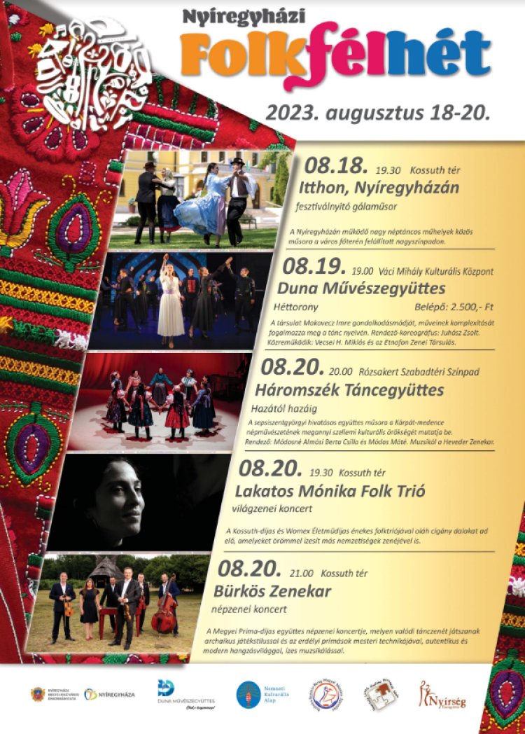 Augusztus 20-án a polgármesteri köszöntőt a Lakatos Mónika FolkTrió koncertje és a Bürkös zenekar műsora követi a Kossuth téren. Idén már második alkalommal rendezi meg a Nyírség Néptáncegyüttes a Nyíregyházi Folkfélhét programját. Három napra, és leginkább hazai előadókra építették a műsort a szervezők. A nyitónapon a Kossuth téri színpadon ott lesz a Nyírség és a Szabolcs, a Szatmár és a Perdülő Néptánccsoport is a Szikes Zenekar zenei kísérete mellett. Másnap, szombaton, a Héttoronnyal szerepel a Duna Művészegyüttes a szabadtéri színpadon.