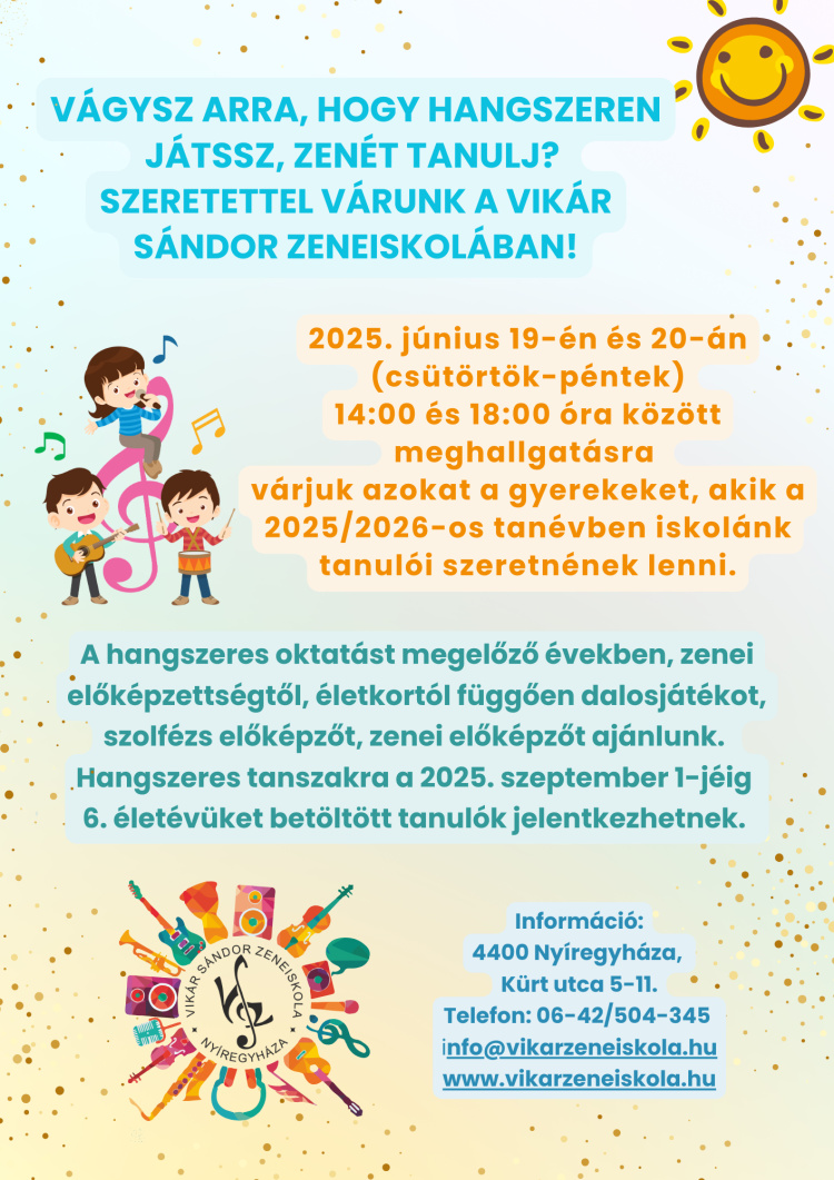 Meghallgatásra várják a Vikár Sándor Zeneiskola-Alapfokú Művészeti Iskola zenepedagógusai azokat a gyerekeket, aki a szeptemberben induló új tanévtől hangszeres képzésben szeretnének részt venni. A jövő muzsikusait június 19-én, csütörtökön és 20-án, pénteken várják a Kürt utcai iskolába.