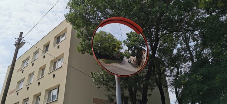 A tükör tovább segíti a közlekedés biztonságosságát a kereszteződésnél.