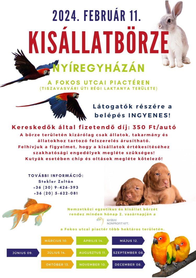 Minden hónap második vasárnapján 6 és 14 óra között várja az érdeklődőket a KISÁLLATBÖRZE Nyíregyházán, a Fokos utcai Piactéren. Az eddigi börzéket hatalmas érdeklődés övezte, ezért minden hónap második vasárnapja biztosít lehetőséget arra, hogy városunkban is hagyománnyá váljon a találkozó. A kis kedvencek mellett megtalálható minden olyan eszköz is, amely a kisállat- és díszállattartáshoz szükséges körülmények megteremtéséhez elengedhetetlen.