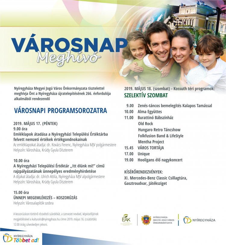 Nyíregyháza Megyei Jogú Város Önkormányzata, valamint az Észak-Alföldi Környezetgazdálkodási Nonprofit Kft. 2019. május 18-án 11. alkalommal rendezi meg a Városnap keretein belül a „Szelektív Szombat” elnevezésű családi vetélkedőnapját, amelynek fókuszában a szelektív hulladékgyűjtés népszerűsítése áll.