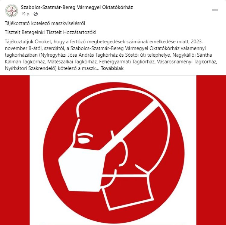 Tájékoztatjuk Önöket, hogy a fertőző megbetegedések számának emelkedése miatt, 2023. november 8-ától, szerdától, a Szabolcs-Szatmár-Bereg Vármegyei Oktatókórház valamennyi tagkórházában (Nyíregyházi Jósa András Tagkórház és Sóstói úti telephelye, Nagykállói Sántha Kálmán Tagkórház, Mátészalkai Tagkórház, Fehérgyarmati Tagkórház, Vásárosnaményi Tagkórház, Nyírbátori Szakrendelő) kötelező a maszkviselés a járó- és fekvőbeteg-ellátást végző részlegeken.