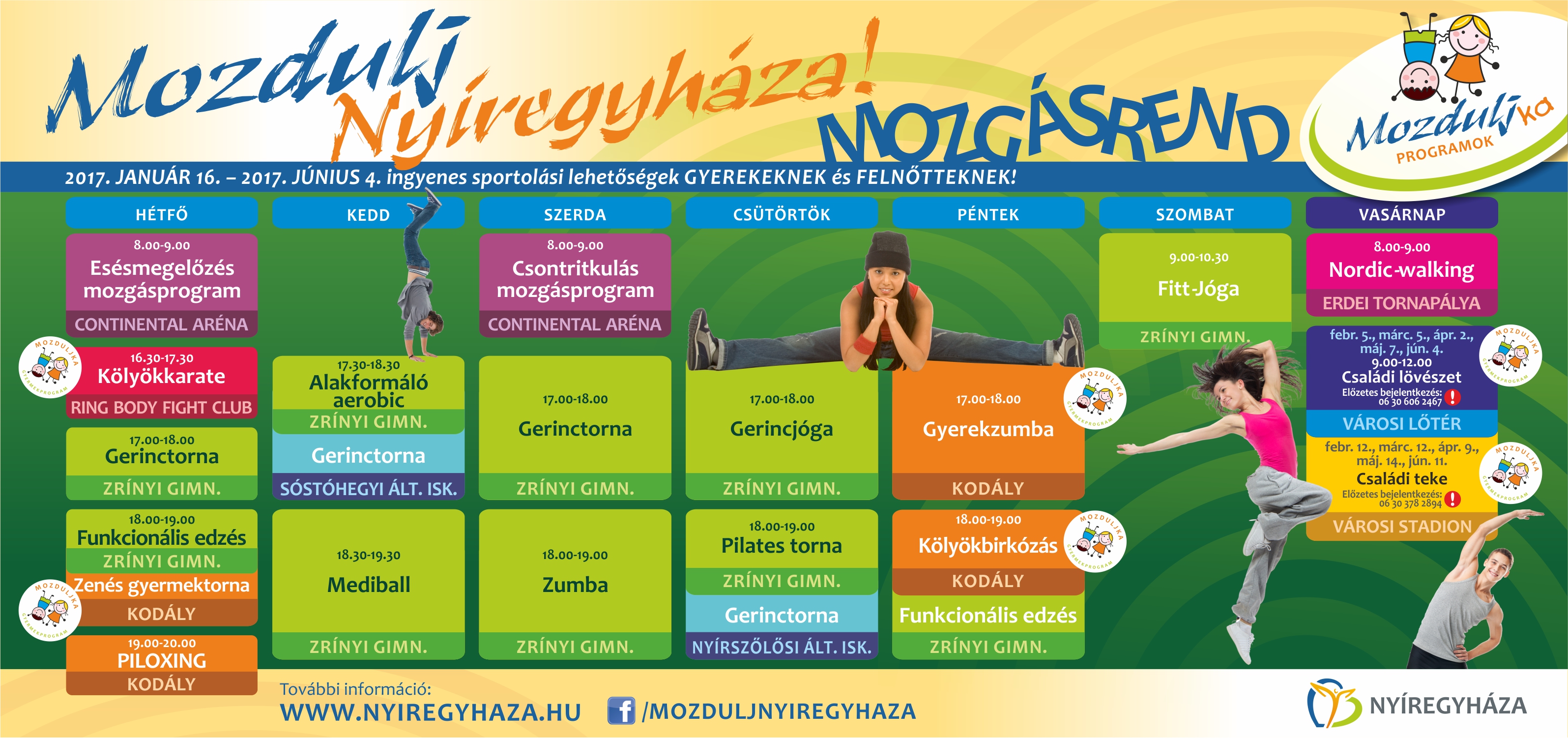 2013 év végén indult útjára a Mozdulj Nyíregyháza, amelynek keretében a város Önkormányzata ingyenes lehetőséget biztosít azoknak, akik tenni szeretnének az egészségükért. A tömegsport az Önkormányzat önként vállalt feladata, amely mozgásra ösztönzi a város lakóit. A 2017-es téli-tavaszi programban 16 mozgásformával, a hét minden napján, különböző helyszíneken várják ingyenesen az érdeklődőket, egészen a gyerekektől az idősebb korosztályig. Idén januárban a hetedik szezon indult el, amely újdonságot is tartalmaz.