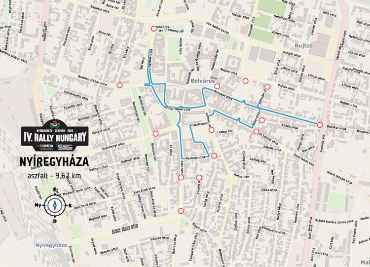 A Rally Hungary rendezvény Nyíregyháza belvárosi szakaszának nyomvonala a Kálmán utca, Bocskai utca, Béla utca, Szent István utca, András utca, Luther utca, Iskola utca, Kürt utca, Kereszt utca, Szarvas utca, Országzászló tér, Kálvin tér, Egyház utca, Mártírok tere, Bethlen Gábor utca, Bercsényi utca, Zrínyi Ilona utca, Kossuth tér, Hunyadi utca térképen megjelölt szakaszait érinti. Felhívjuk a lakosság figyelmét, hogy az idei verseny nyomvonala érinti az Egyház utcai murvás parkolót is, így az a terület szintén a megállni tilos táblák hatálya alá fog tartozni.