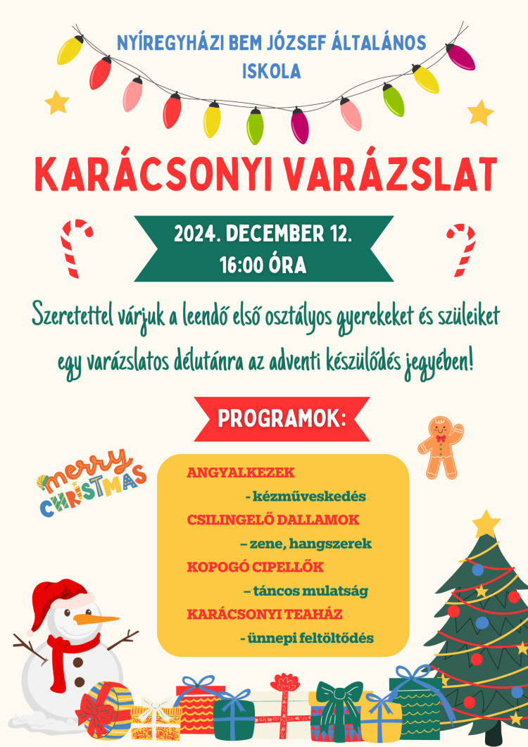 A Nyíregyházi Bem József Általános Iskola (Nyíregyháza, Epreskert utca 10.) 2024. december 12-én, csütörtökön 16 órától szeretettel várja a leendő első osztályos gyerekeket és szüleiket egy varázslatos karácsonyváró délutánra az adventi készülődés jegyében!