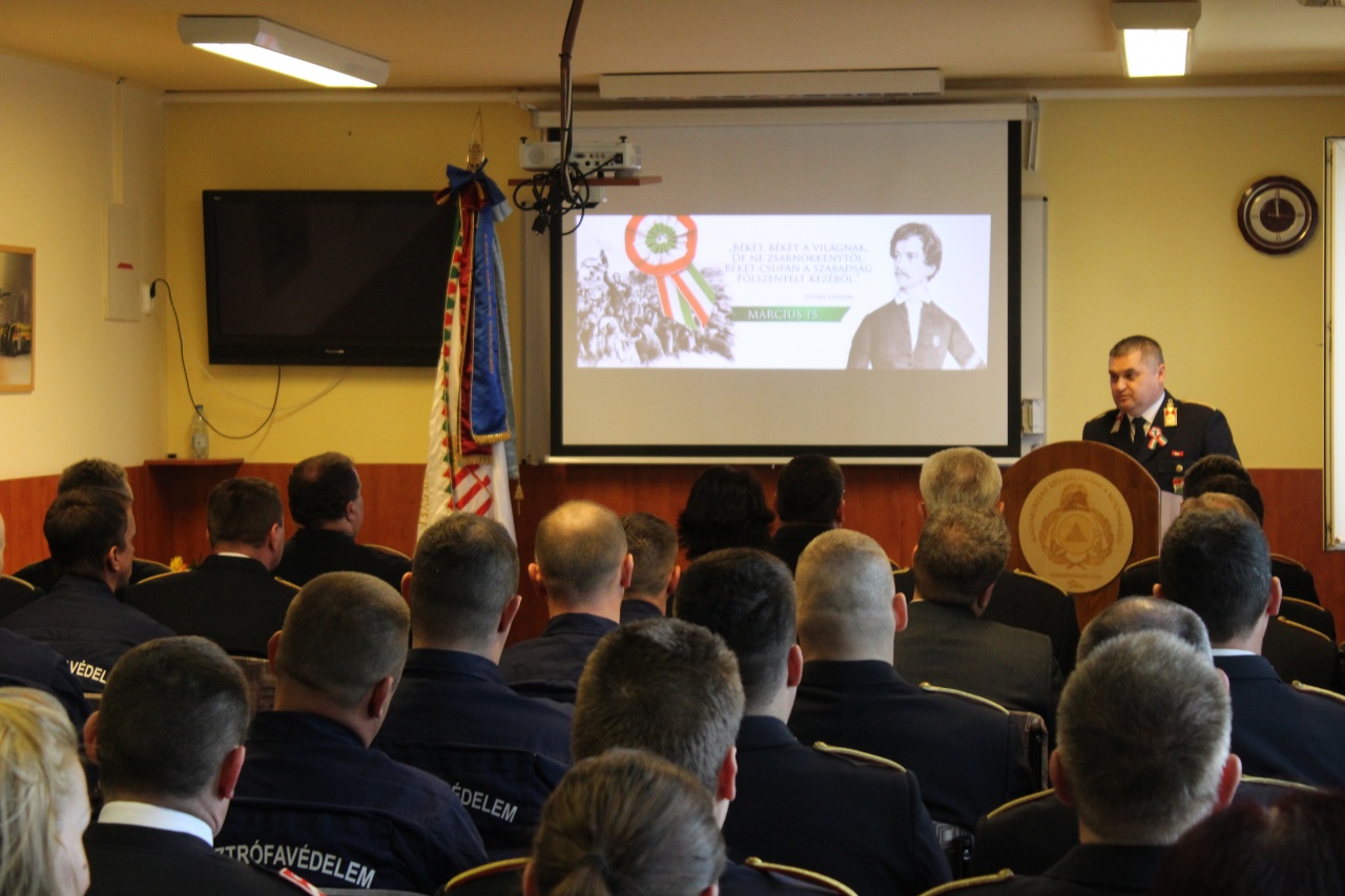 A Himnuszt követően, Leskovics Zoltán tű. alezredes, megyei tűzoltósági főfelügyelő elevenítette fel az 61 éve történt eseményeket, amelyben kiemelte: Október 23-án az egyetemi ifjúság és a hozzá csatlakozó tömeg azt mondta: ne legyen akárhogy! Elég volt a megalázottságból, a félelemből és kiszolgáltatottságból, az éjszakai elhurcolásokból és a rögtönítélő népbírósági perekből. Az 1956-os forradalom Magyarország népének a sztálinista diktatúra elleni forradalma és a szovjet megszállás ellen folytatott szabadságharca, amely a 20. századi magyar történelem egyik legmeghatározóbb eseménye volt, bár a tűzoltók közvetlenül nem vettek részt a forradalomban, de több esetben is a szabadságharc küzdelmei során kigyulladt épületeknél kellett helytállniuk.