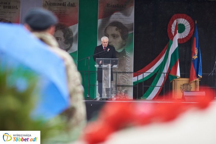 Térzenével várták a megemlékezésre érkezőket Nyíregyházán a Kossuth téren. Ünnepi beszédet mondott dr. Kovács Ferenc polgármester. Méltatta a 48-as hősöket, szólt a forradalom és szabadságharc nyíregyházi résztvevőiről, de a megyeszékhely jelenlegi, folyamatos fejlődéséért végzett közös munkáról is. Hangsúlyozta, március 15-e ma is a nemzet erejére és elszántságára emlékeztet bennünket. Arra, hogy legyen ma is béke, szabadság és egyetértés. Mi valamennyien a jövőt építjük, egy erős Magyarországot, erős Nyíregyházát, ahol az emberek őszintén szorítják meg egymás kezét, ahol a fiatalok ismerik a történelmünket, az örökségünket, hisznek magukban.