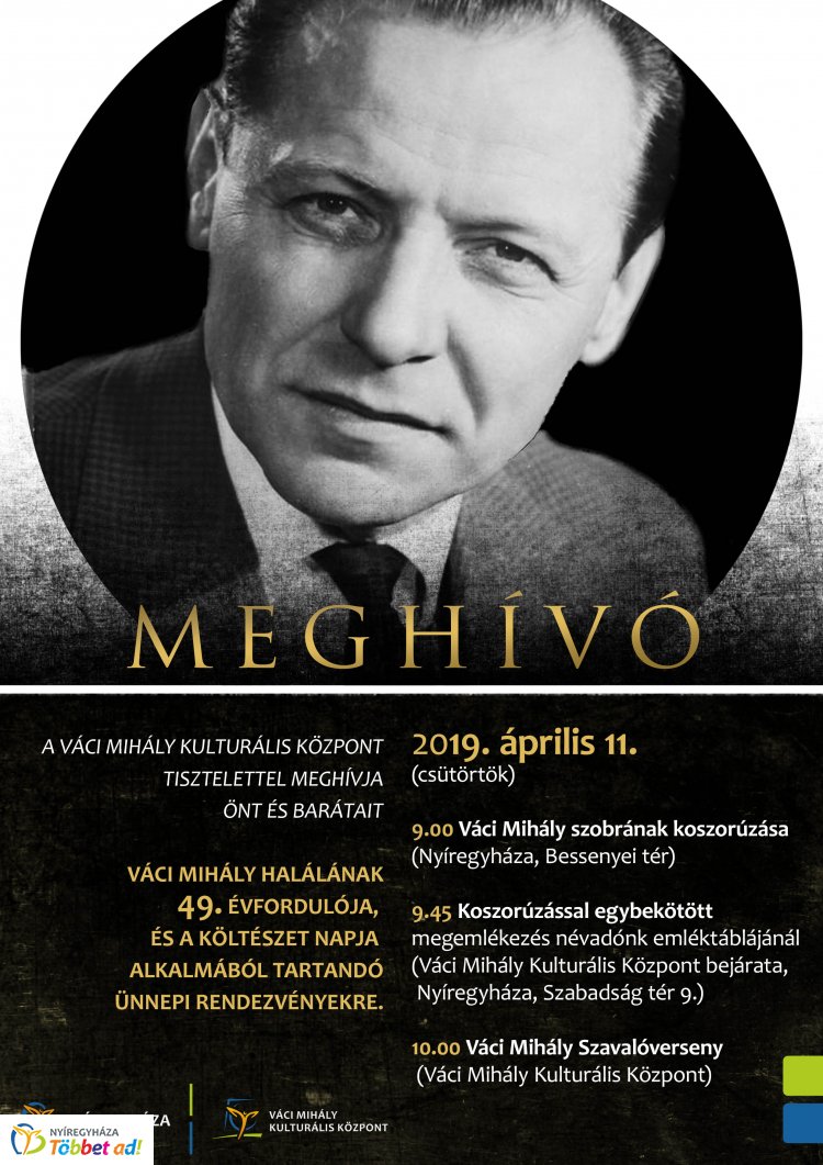 Koszorúzással egybekötött megemlékezéseket, szavalóversenyt tartanak Váci Mihály halálának 49. évfordulója és a Költészet Napja alkalmából Nyíregyházán, április 11-én.