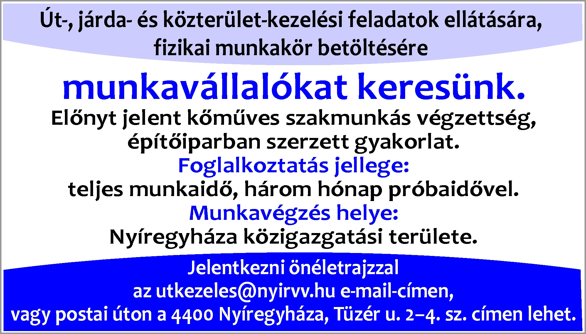 Jelentkezni önéletrajzzal az utkezeles@nyirvv.hu e-mail-címen, vagy postai úton a 4400 Nyíregyháza, Tüzér u. 2–4. sz. címen lehet.