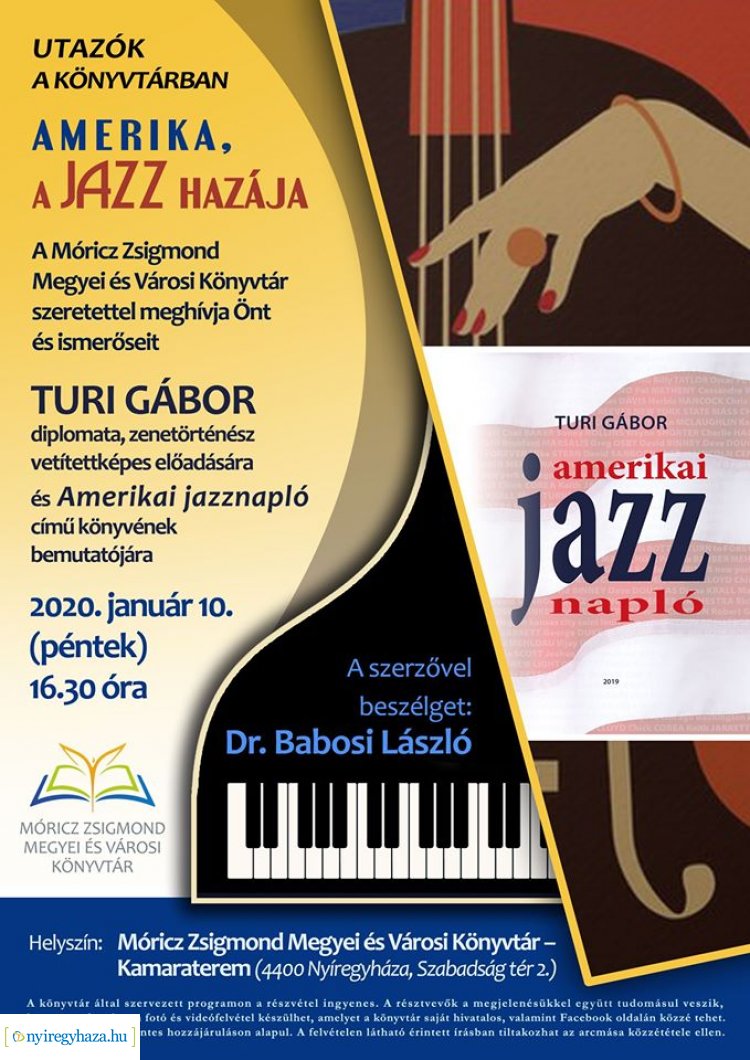 Január 10-én a Móricz Zsigmond könyvtárban Turi Gábor diplomata, zenetörténész tart vetítettképes előadást, Amerika, a jazz hazája címmel és bemutatja az Amerikai jazznapló című könyvét is.