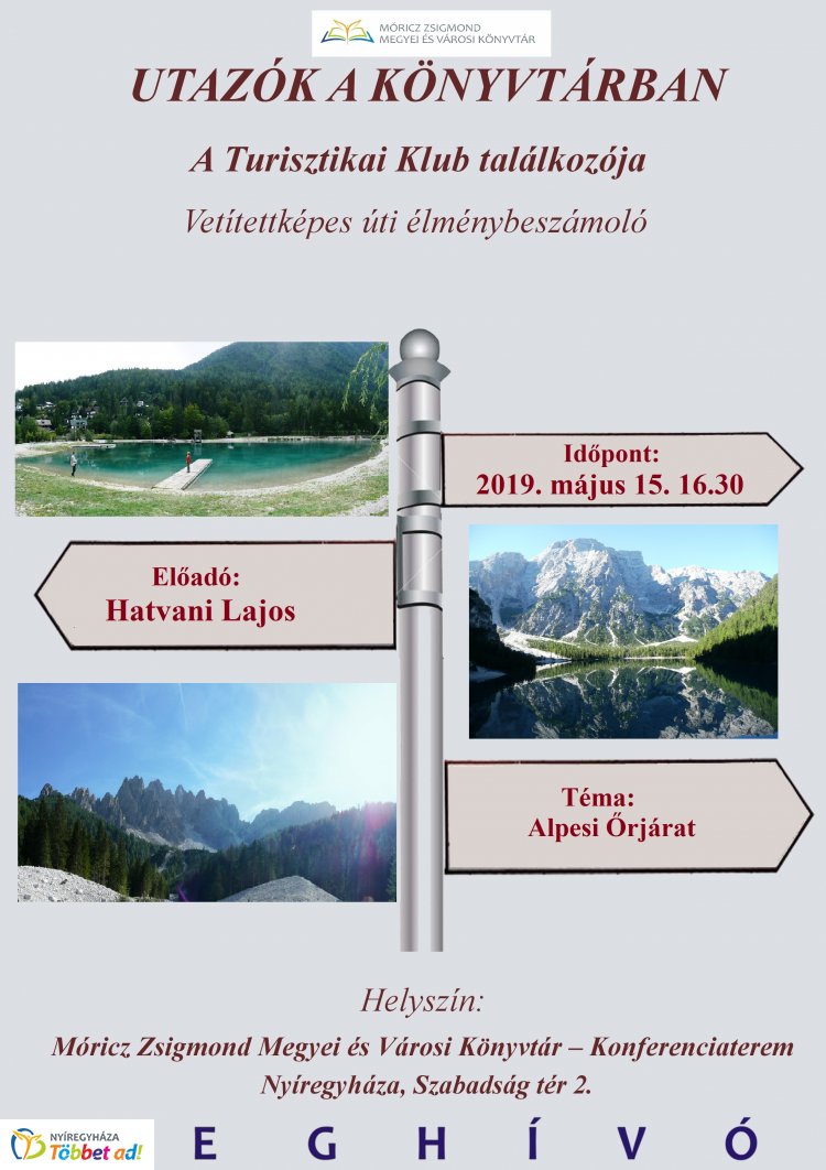 A Turisztikai Klub soron következő találkozójára május 15-én várják az érdeklődőket, a helyszín ezúttal is a Móricz Zsigmond Megyei és Városi Könyvtár.