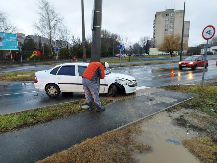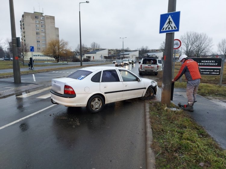A Semmelweis utcán egy autós az útpadkának, majd a gyalogátkelőhelynél lévő villanyoszlopnak ütközött.