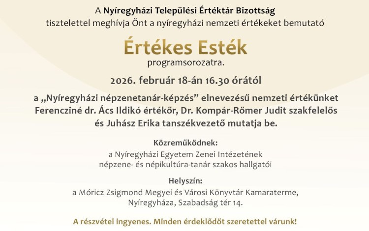 A téma iránt érdeklődők február 18-án, szerdán 16:30-tól hallgathatják meg az erről szóló előadást a könyvtárban, az Értékes Esték programsorozat keretében. Az esemény lehetőséget ad arra, hogy a résztvevők közelebbről is megismerjék azt a szellemi műhelyt, amely Nyíregyházáról indította útjára a magyar népzenetanár-képzést.