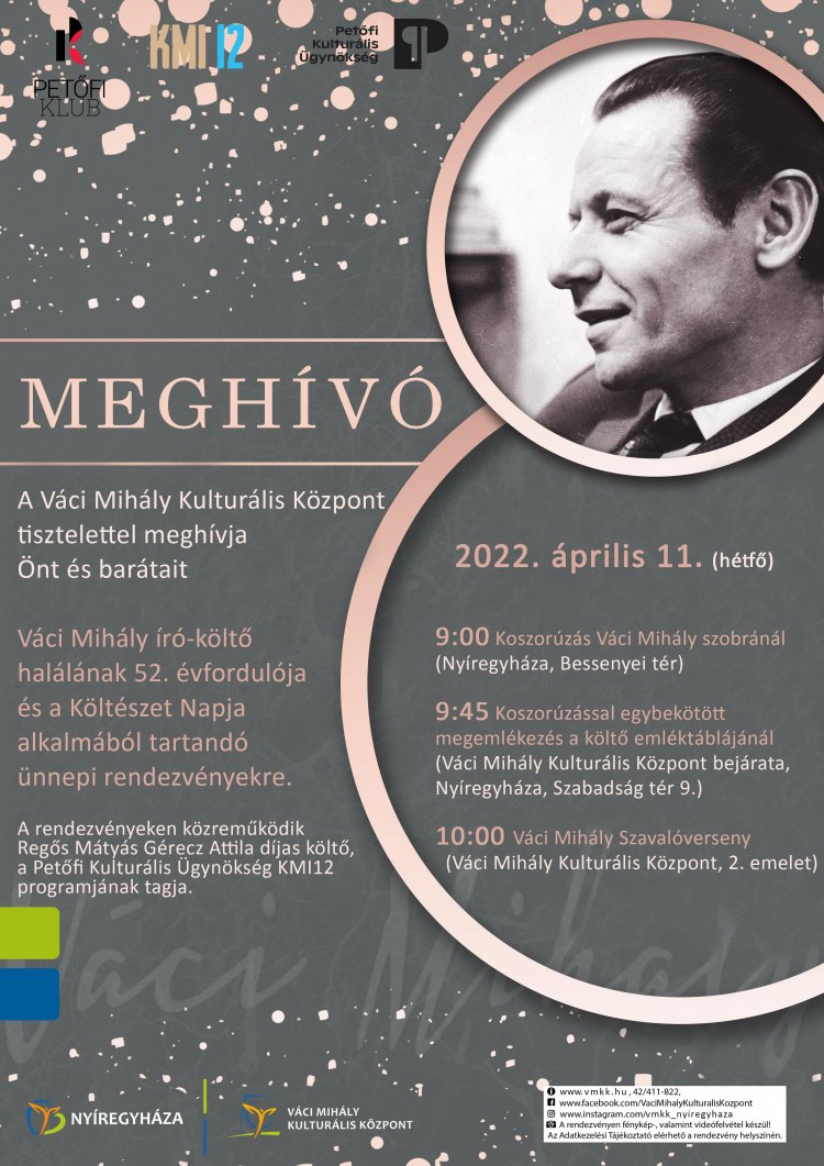Váci Mihály író-költő halálának 52. évfordulója és a Költészet Napja alkalmából, április 11-én ünnepi megemlékezésre várja a városlakókat a Váci Mihály Kulturális Központ.