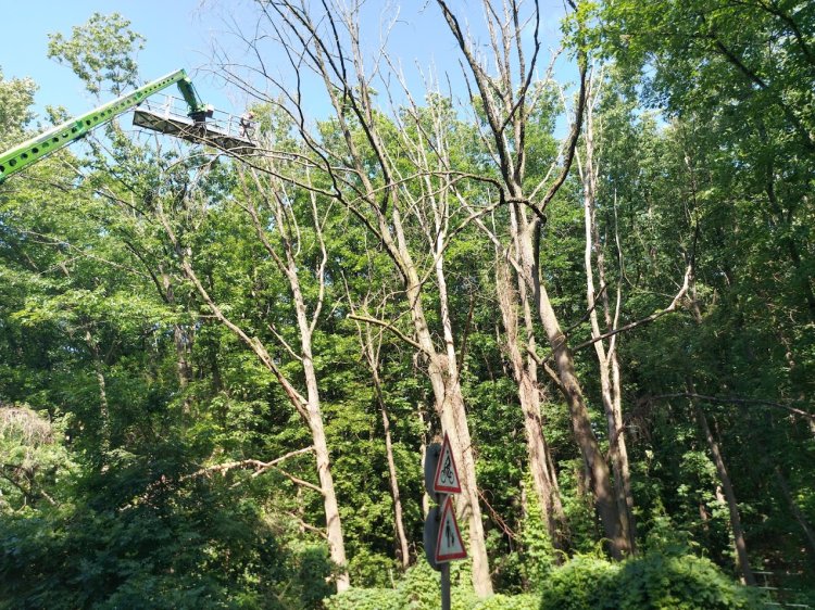 Forgalomkorlátozása mellett, emelőkosárból vágták az állatpark kihajló, száraz ágait a Kemecsei úton.