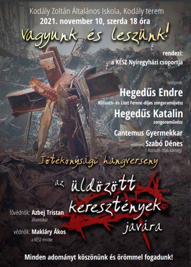 Hegedűs Endre és Hegedűs Katalin zongoraművészek, valamint a Cantemus Gyermekkar lép közönség elé november 10-én a Kodály Zoltán Általános Iskolában, a KÉSZ Nyíregyházi Csoportjának jótékonysági rendezvényén. A befolyt összeget az üldözött keresztények javára ajánlják fel.