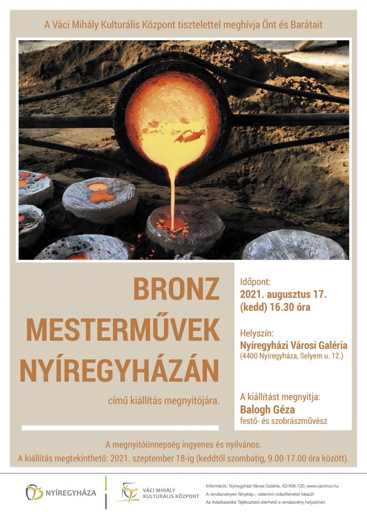 Bronz mesterművek Nyíregyházán címmel nyílik kiállítás augusztus 17-én a Sóstói Nemzetközi Éremművészeti és Kisplasztikai Alkotótelep munkáiból. A tárlat szeptember 18-ig fogadja a látogatókat a Nyíregyházi Városi Galériában.