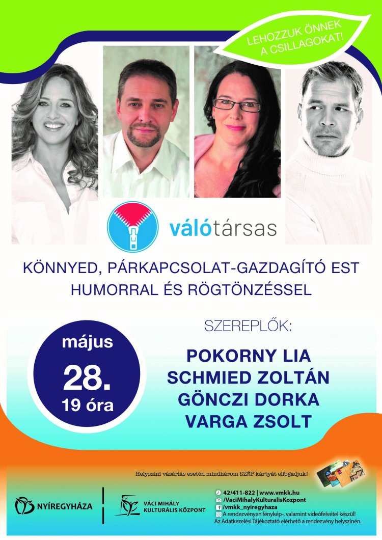Válótársas - könnyed, szórakoztató előadás a párkapcsolatokban előforduló helyzetekről és azok megoldásairól - várja az érdeklődőket május 28-án a Váci Mihály Kulturális Központban. Szereplők: Pokorny Lia, Schmied Zoltán, Gönczi Dorka, Varga Zsolt
