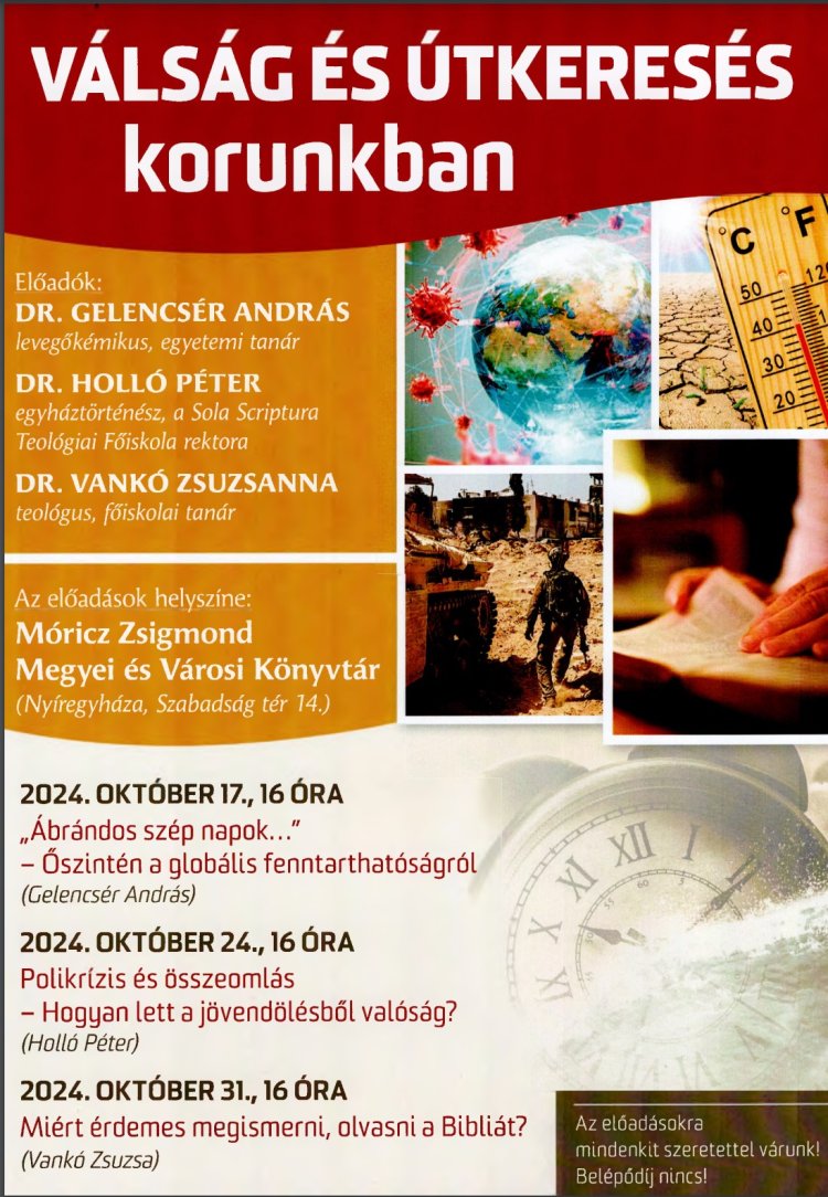 Három, érdekes előadásra hívja fel a figyelmünket a MóriczZsigmond Megyei és Városi Könyvtár. Szó esik majd a fenntarthatóságról, megtudhatjuk, mit jelent a polikrízis és végül arra is választ kapunk, miért érdemes megismerni a bibliát.