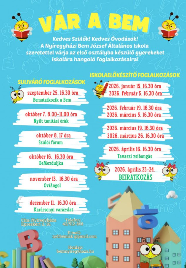 A Nyíregyházi Bem József Általános Iskola valamennyi munkatársa nagyon fontosnak tartja azt, hogy a szülők betekintést nyerjenek az iskola életébe. Lényeges, hogy a 2026/2027-es tanévben első osztályt kezdő gyermekek és szüleik megismerkedhessenek az iskolával és az ott folyó munkával. Éppen ezért nyílt tanítási napra, szülői fórumra várja a Bem azokat a gyerekeket és szüleiket, akik érdeklődnek a kiváló akkreditált tehetségpontként működő iskola iránt.