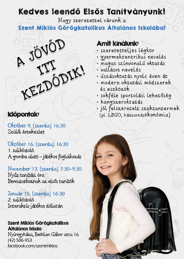A Szent Miklós Görögkatolikus Általános Iskola több alkalommal is várja a leendő elsősöket és szüleiket, hogy közelebbről megismerkedhessenek az intézmény szellemiségével és programjaival. Az első esemény egy szülői értekezlet lesz október 9-én, ahol tájékozódhatnak az iskolai életről.