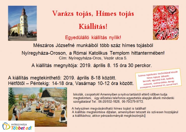 Mészáros Józsefné munkáiból, több száz hímes tojásból álló kiállítás tekinthető meg április 8-18. között az orosi római katolikus templom hittantermében.