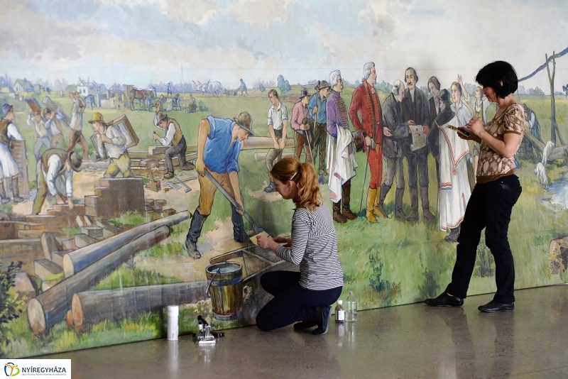 – A festményt anno nem szakszerűen, a festékréteggel befelé tekerték fel, így az évek során nagyon rossz állapotba került. Két restaurátor több mint két hónapig dolgozott rajta. Az első számú feladat az volt, hogy a festményre lerakódott piszokrétegtől megtisztítsuk, majd ezt követően a besárgult lakkrétegtől is megszabadítottuk az alkotást – mondja Zsíros Ágnes, restaurátor-művész. A vásznon számtalan szakadás volt és hiányoztak belőle darabok is. Egy része rendkívül gyűrött volt, azt konzerválták és vasalták. A festmény három vászondarabból van összevarrva, mivel nagyon sokáig fel volt tekerve, a varrások mentén beráncosodott. – A tökéletes simaságot szakszerű konzerválással lehetne enyhíteni, de erre most anyagi okok miatt nem kerülhetett sor, viszont amennyire lehetett, vasalással oldottuk meg a simítást. A festékhiányokat pótoltuk. Az egész festményt elláttuk egy húzószéllel, amellyel az új keretre lehet erősíteni. Befejezésként egy lakkréteget helyeztünk rá és a végén a hiányokat kiretusáltuk olajfestékkel – folytatta a restaurátor.