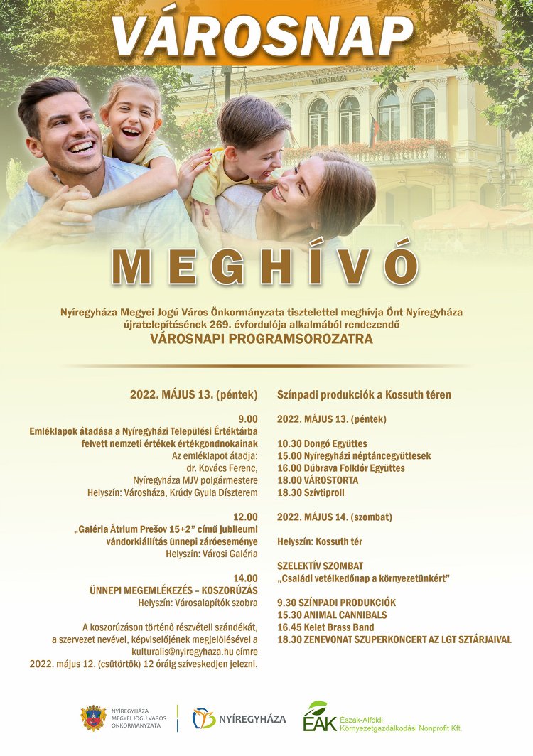 Két év szünet után idén ismét Városnapot ünnepelnek a nyíregyháziak, a testvérvárosok delegációival. A hivatalos eseményeken túl műsort ad a Dongó és a Szívtiproll, majd fellépnek folklór- és táncegyüttesek is. Megkóstolhatják a jonatán almás, fehér csokis várostortát is. A Szelektív Szombat családi vetélkedőt kínál, táncot és zenét az Animal Cannibals vagy az LGT sztárjaival.