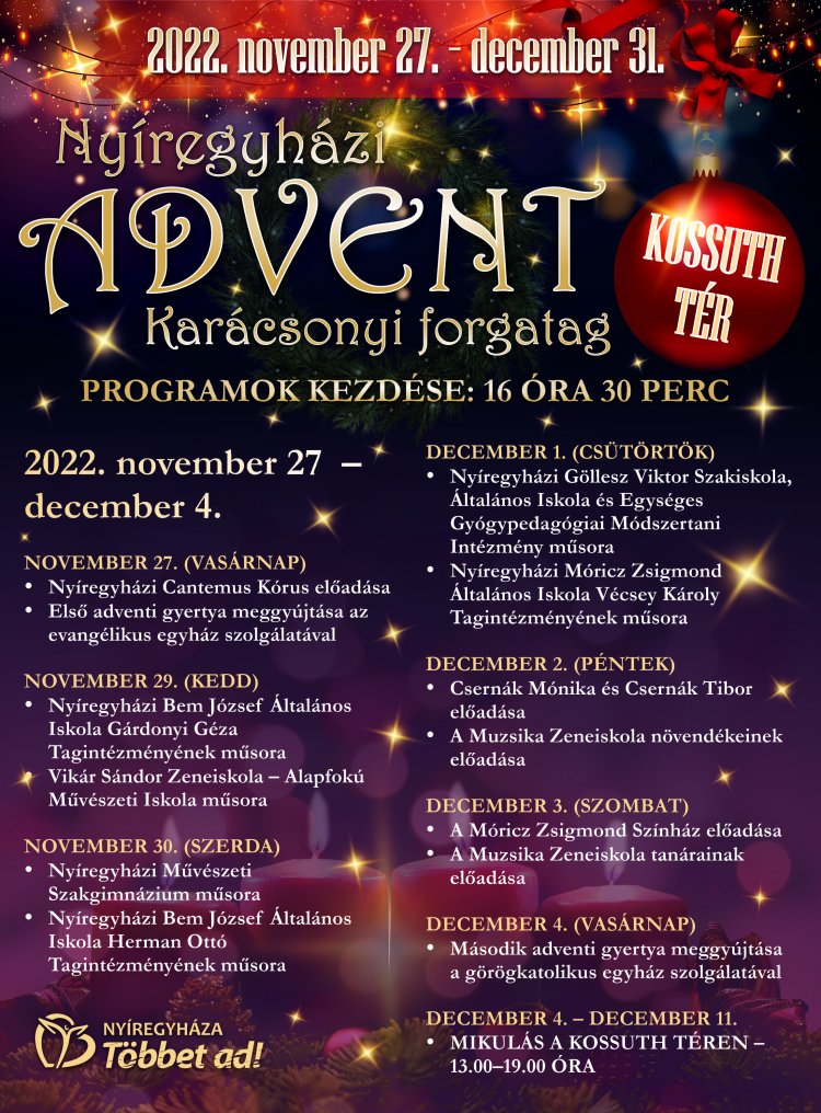 Közreműködik a Nyíregyházi Cantemus Kórus. A gyertyagyújtást követően a Túróczy Zoltán Evangélikus Óvoda és Magyar-Angol Két Tanítási Nyelvű Általános Iskola adventi műsorát tekinthetik meg az érdeklődők.