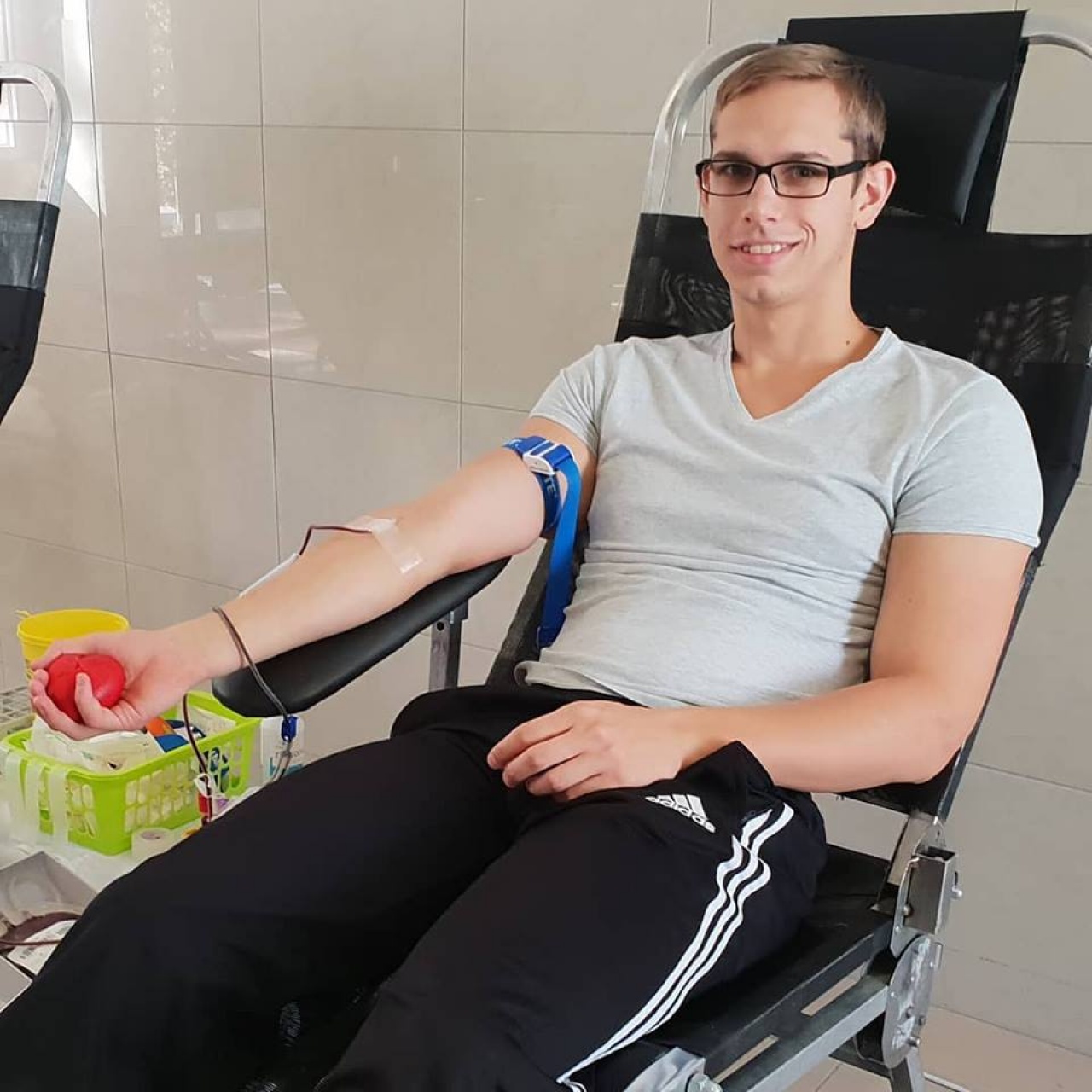 Egy hallgató vért ad a Nyíregyházi Egyetemen szervezett véradáson. Ő azért jött el, mert egészségesként kötelességének érzi, hogy ezzel is segítsen másokon.