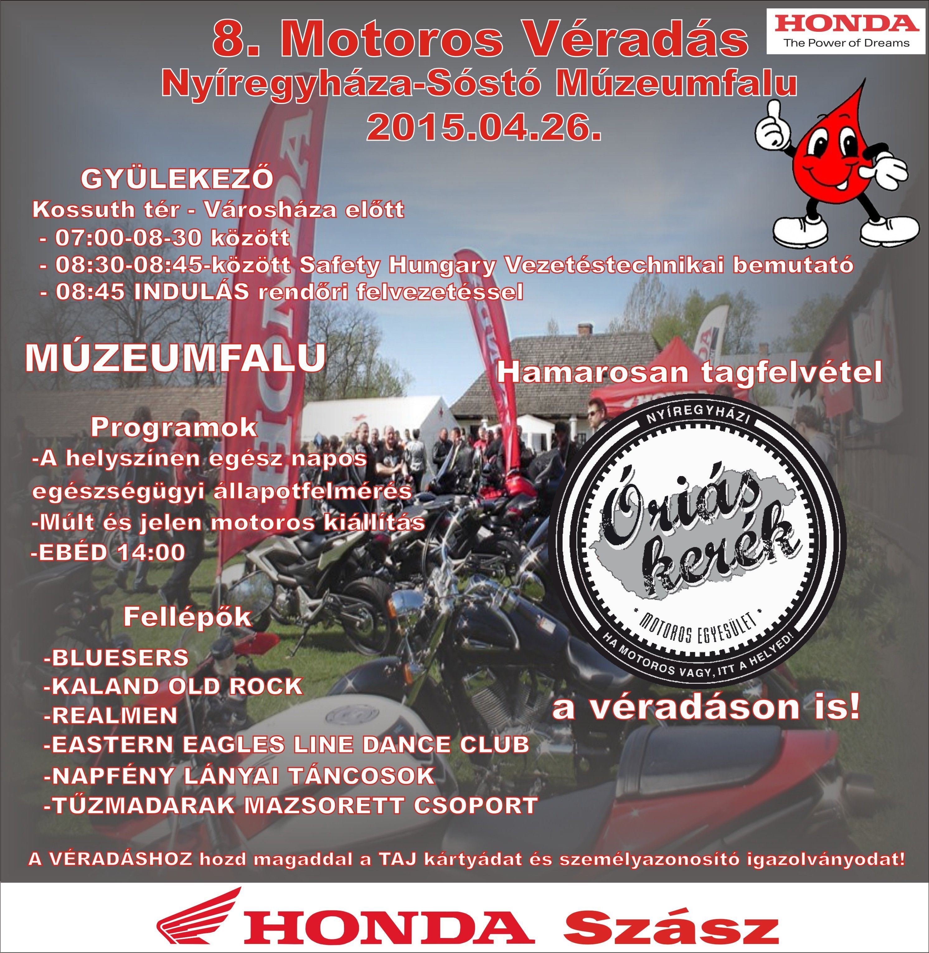 A közelmúltban alakult Nyíregyházi Óriáskerék Motoros Egyesület első nagy rendezvényére 2015. április 26-án kerül sor. A Sóstói Múzeumfaluban nyolcadik alkalommal kerül megrendezésre a motoros véradás, melyre az ország minden pontjáról várják a segíteni szándékozó motorosokat.