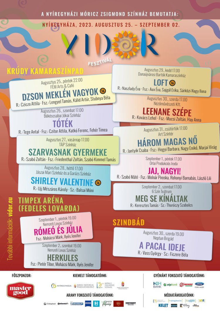Zenés vígjátékok, szatíra, tragikomédia, bohózat, komédiák sokasága, musicalek és kocsmaária is szerepel a színházi versenyprogramban, melynek teljes listáját a Móricz Zsigmond Színház és VIDOR Fesztivál hivatalos weboldalán találhatják meg az érdeklődők. A VIDOR Fesztivál 2023 válogatói Kirják Róbert teátrumigazgató, Horváth Illés művészeti vezető és Sediánszky Nóra művészeti tanácsadó voltak, akik arra törekedtek a program összeállítása során, hogy a nézőknek feledhetetlen élménykavalkádban legyen részük.