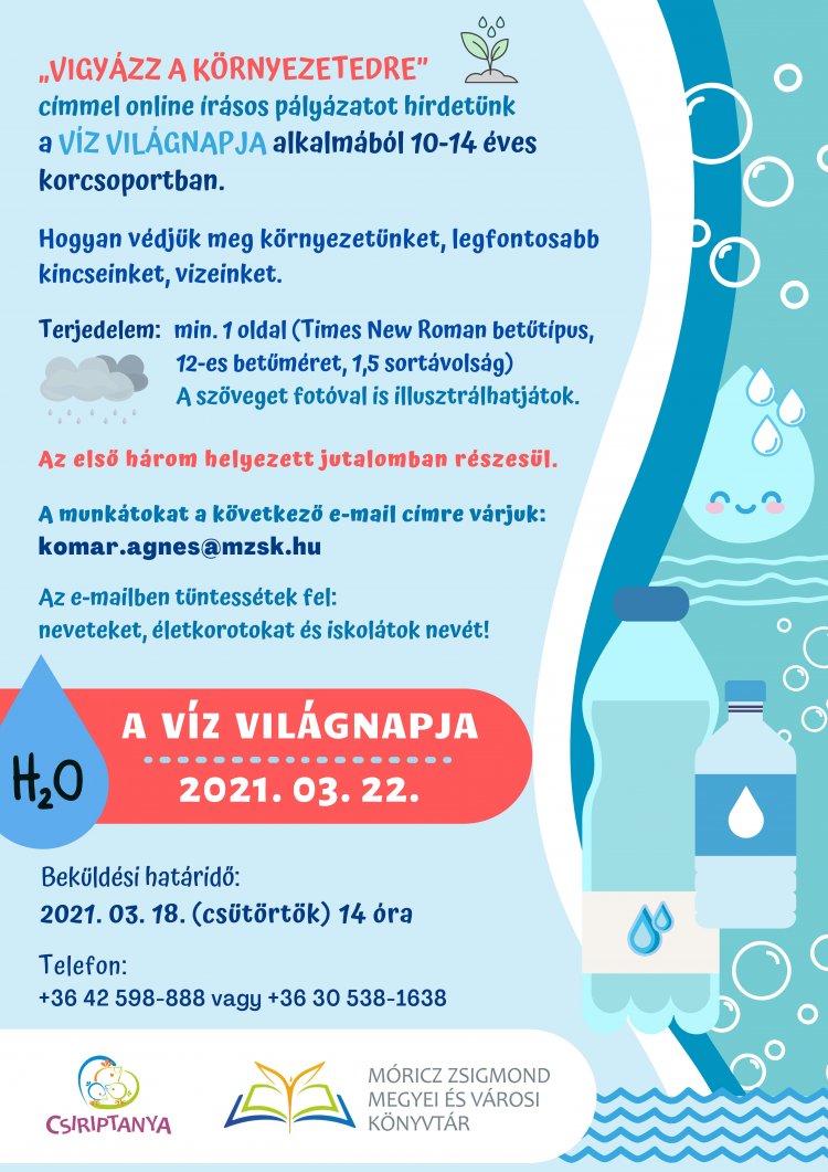 A víz világnapja alkalmából online írásos pályázatot hirdet a Móricz Zsigmond Megyei és Városi Könyvtár, 10-14 éves korcsoportban. A „Vigyázz a környezetedre" című pályázat anyagának beküldési határideje: március 18.