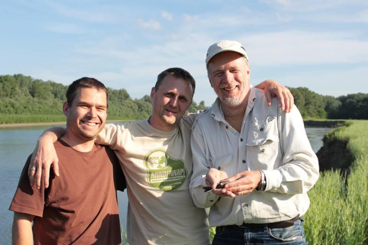 (Felső kép: Az elsõként visszafogott geolokátoros partifecske 2013-ban Szabolcs község térségben és a terepi munkában részt vevõk öröme. Balról jobbra: Pelenczei Ákos, Nagy Zsolt és dr. Szép Tibor)