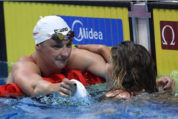 Hosszú Katinka (b) és Szilágyi Liliána a női 200 méteres pillangóúszás elődöntője után a 17. vizes világbajnokságon a Duna Arénában 2017. július 26-án. MTI Fotó: Illyés Tibor.