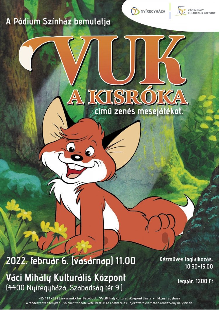Családi programot kínál február 6-án a Váci Mihály Kulturális Központ. Vuk, a kisróka története a Pódium Színház előadásában ígér kellemes vasárnapi kikapcsolódást. Emellett kézműves foglalkozás is várja az érdeklődőket.