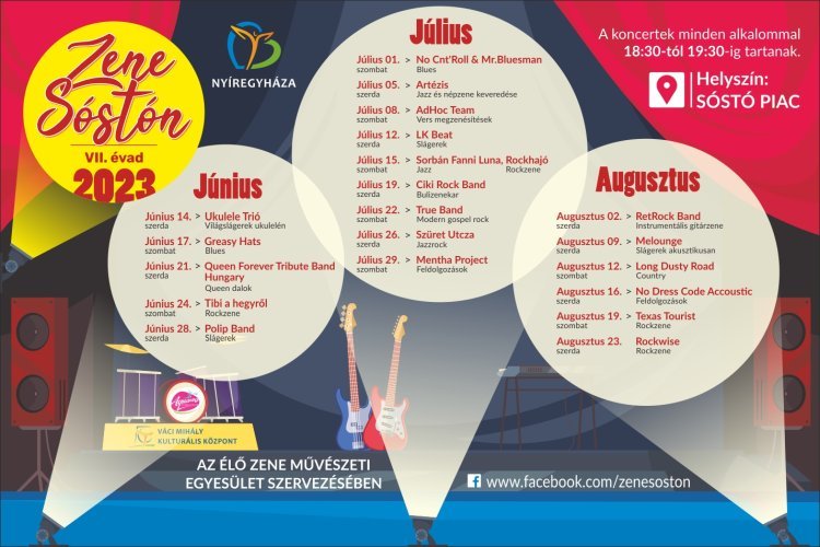 Június 14-én kezdi hetedik évadát a Zene Sóstón programsorozat, mely a Sóstói Piac területén minden szerdán és szombaton színes koncertekkel várja az érdeklődőket egészen augusztus 23-ig. A nyitányként az Ukulele Trió szórakoztatja a közönséget, de a nyár során lesz jazz, blues, modern gospel, slágerek és rockzene is.