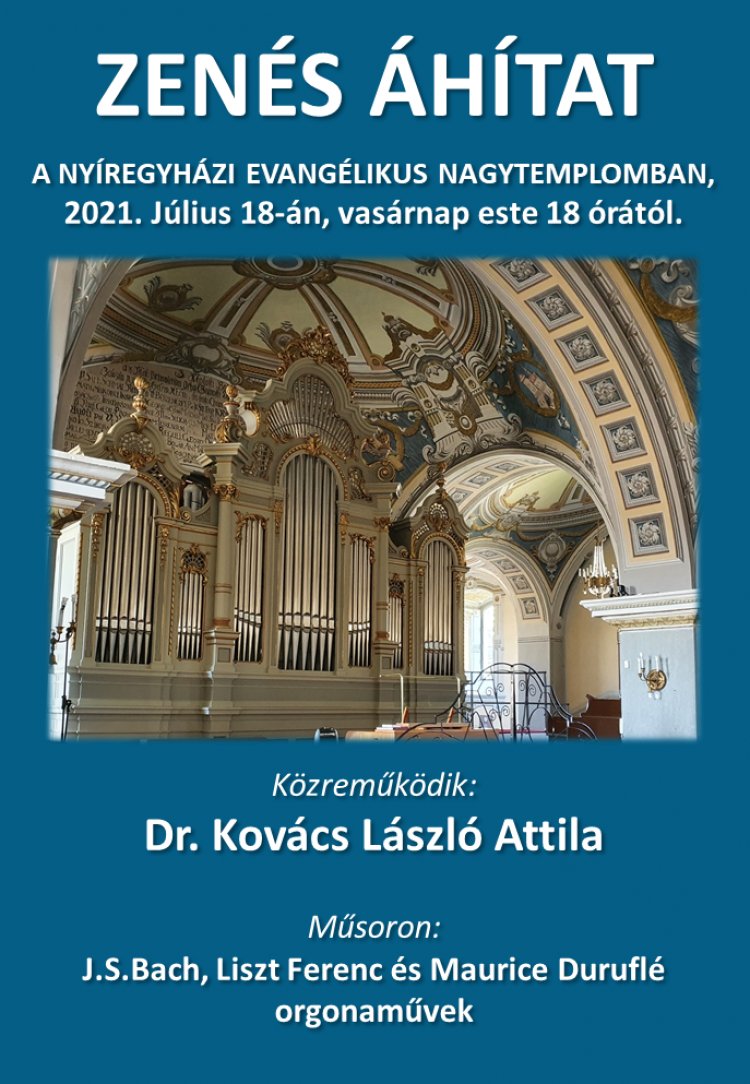 Az evangélikus egyház ismét zenés áhítatra hívja az érdeklődőket. Július 18-án, vasárnap este 18 órától az evangélikus nagytemplomban dr. Kovács László Attila lelkész-orgonista J.S. Bach, Liszt Ferenc és Maurice Duruflé orgonaműveket fog előadni.
