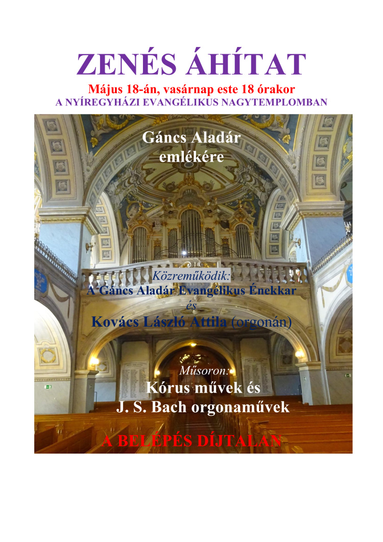 Ezt az alkalmat a 100 évvel ezelőtt született Gáncs Aladár orgonista/lelkész emlékének szenteljük, aki 1952 és 1978 között szolgált Nyíregyházán és nevéhez fűződnek a Nyíregyházi Orgonaesték.